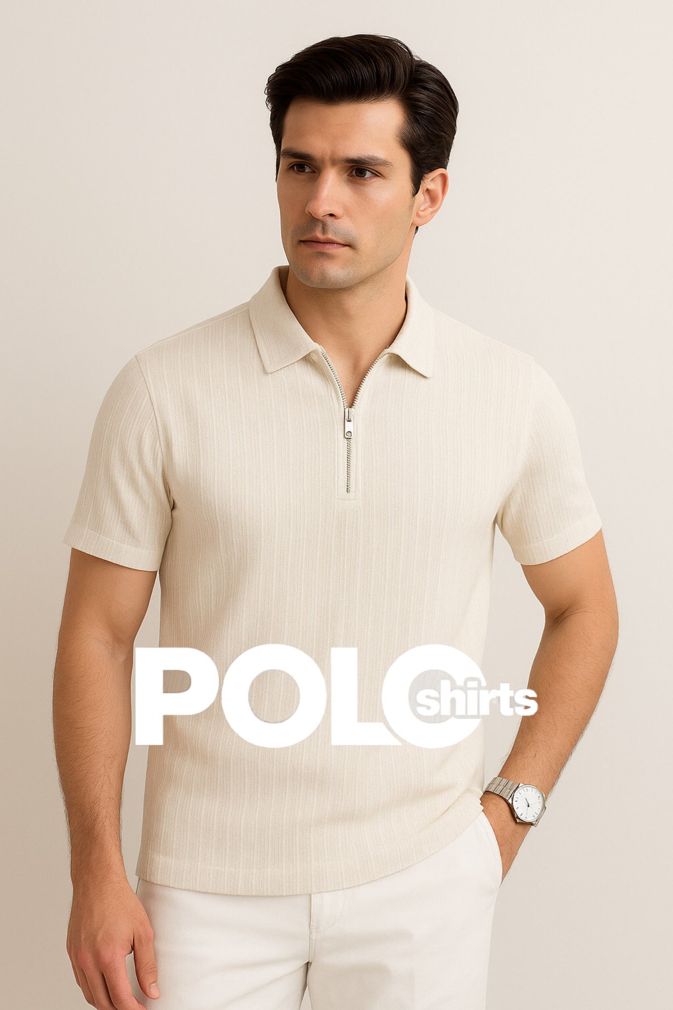 Men’s White Textured Zip Polo Shirt – Premium Casual Wear
