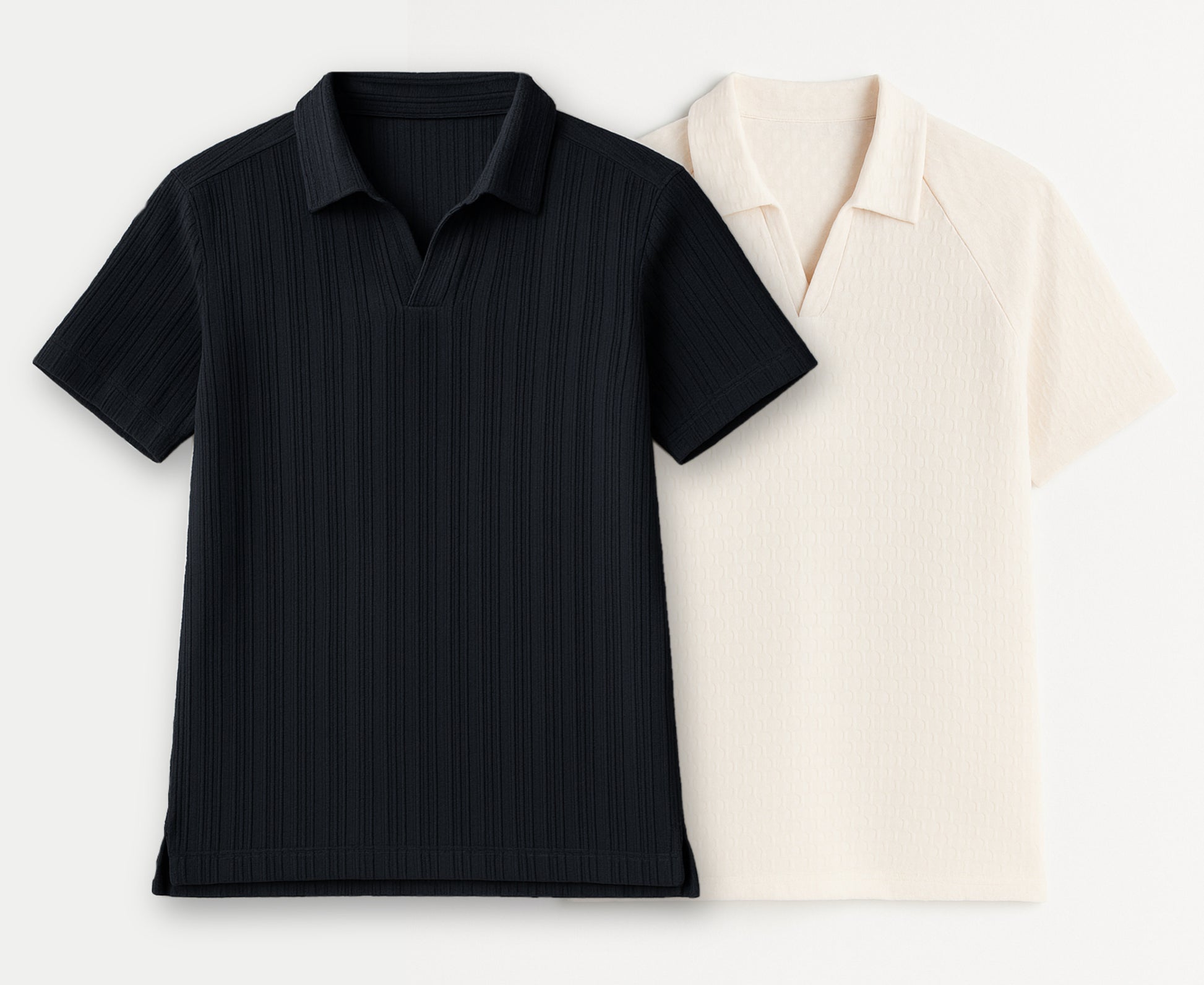 The off-white polo features a subtle honeycomb texture for a clean, minimal aesthetic, while the Black polo comes with vertical ribbed detailing for a sharp and stylish edge. Made from soft, breathable fabric, these polos keep you comfortable all day long without compromising on style.